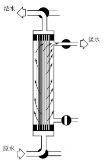超滤(UF)是利用一种压力活性膜从而除去水中的胶体、颗粒和分子量高的物质。与反渗透相同,受压溶液是在压力下通过膜(图3-4-15),膜的设计可使一定大小的分子被除去。
